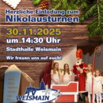 Herzliche Einladung zu unserem Nikolausturnen am 01.12.2024 ab 14:30 in der Stadthalle Weismain. Wir freuen uns über Euer Kommen!