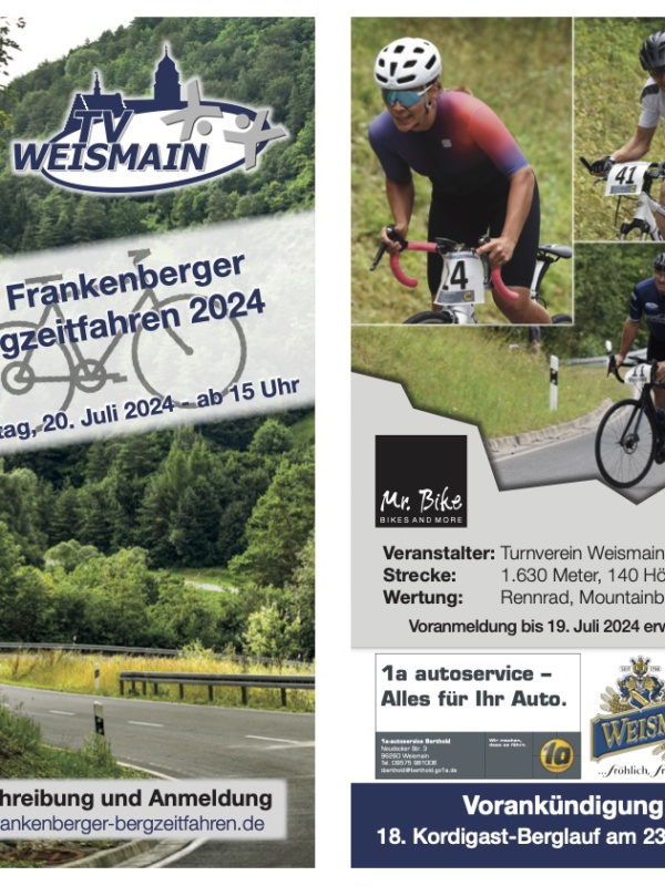 Vielen Dank für Eure Teilnahme am diesjährigen Frankenberger Bergzeitfahren. Hier gibt es die Ergebnisse. Nicht vergessen: 18. Kordigast-Berglauf am 23.11.2024. Wir freuen uns über Eure Teilnahme!